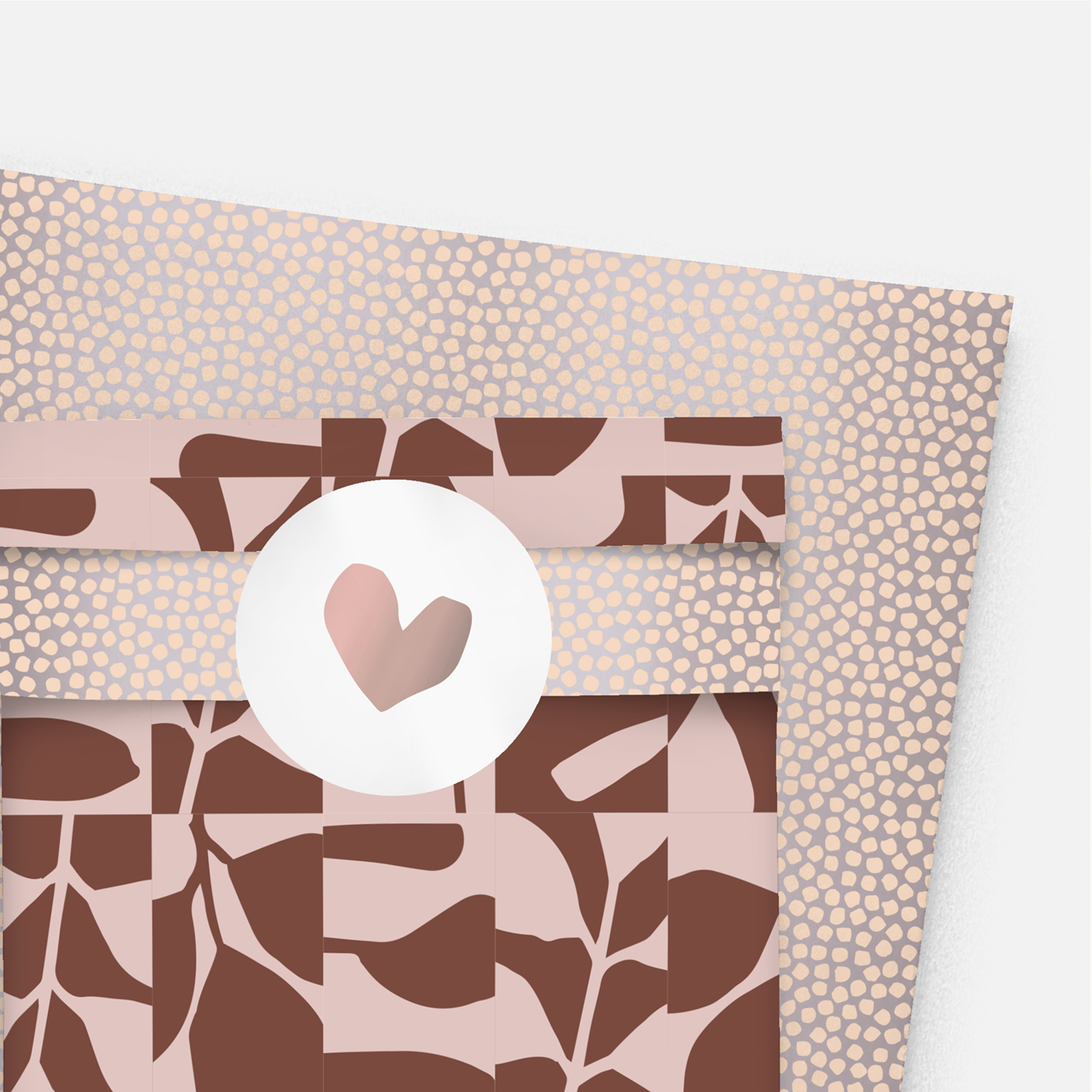 Dit dessin is geïnspireerd op trends die je terugziet in interior design. De bladstructuren vormen in een modern patchwork een prachtig abstract geheel. Deze cadeauzakjes zijn gemaakt van prachtig dubbelzijdig gestreken FSC papier dat we aan twee zijden met watergedragen inkt bedrukt hebben. Het papier is 80 grams en voelt lekker stevig aan.