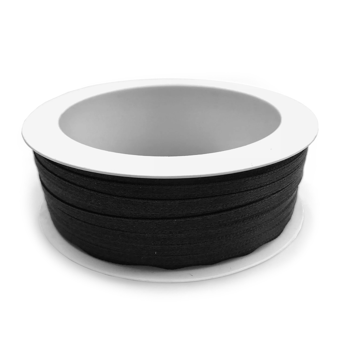 Zwart satijnlint. 3 mm breed. 1 spoel van 50m. Geschikt voor grootverbruik thuis of in een winkel.